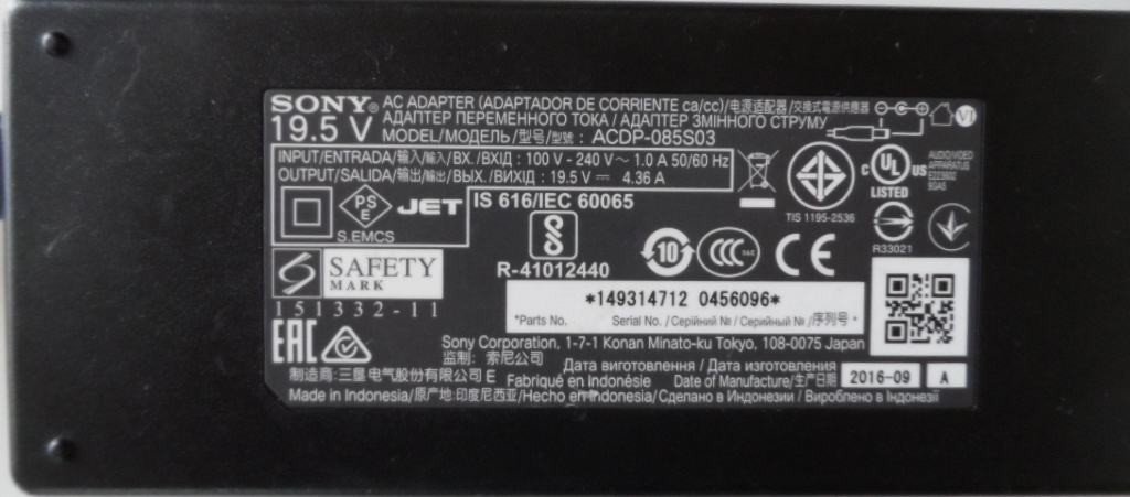 ADAPTER ORIGINAL for SONY, 19.5V/4.36A, ACDP-085S03,