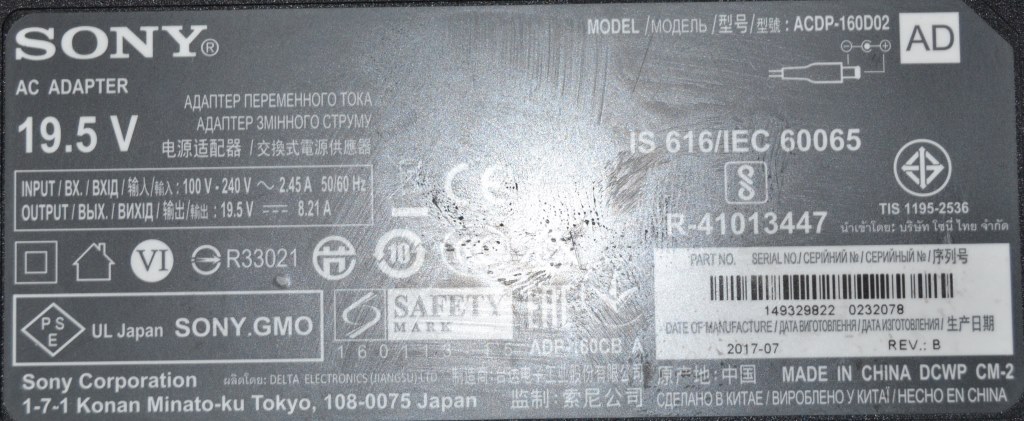 ADAPTER ORIGINAL for SONY, 19.5V/8.21A, ACDP-160D02,