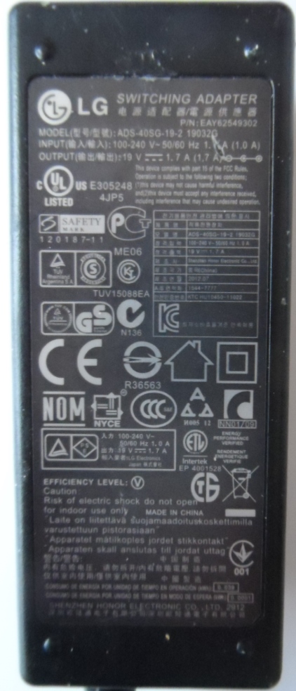ADAPTER ORIGINAL model ADS-40SG-19-2 for LG 19V 1.7A ,EAY62549302,